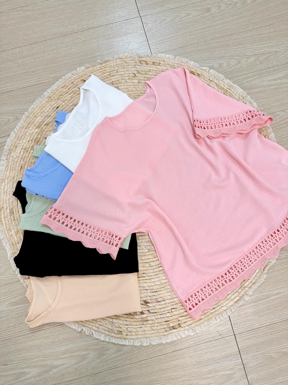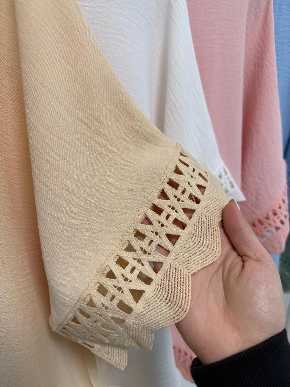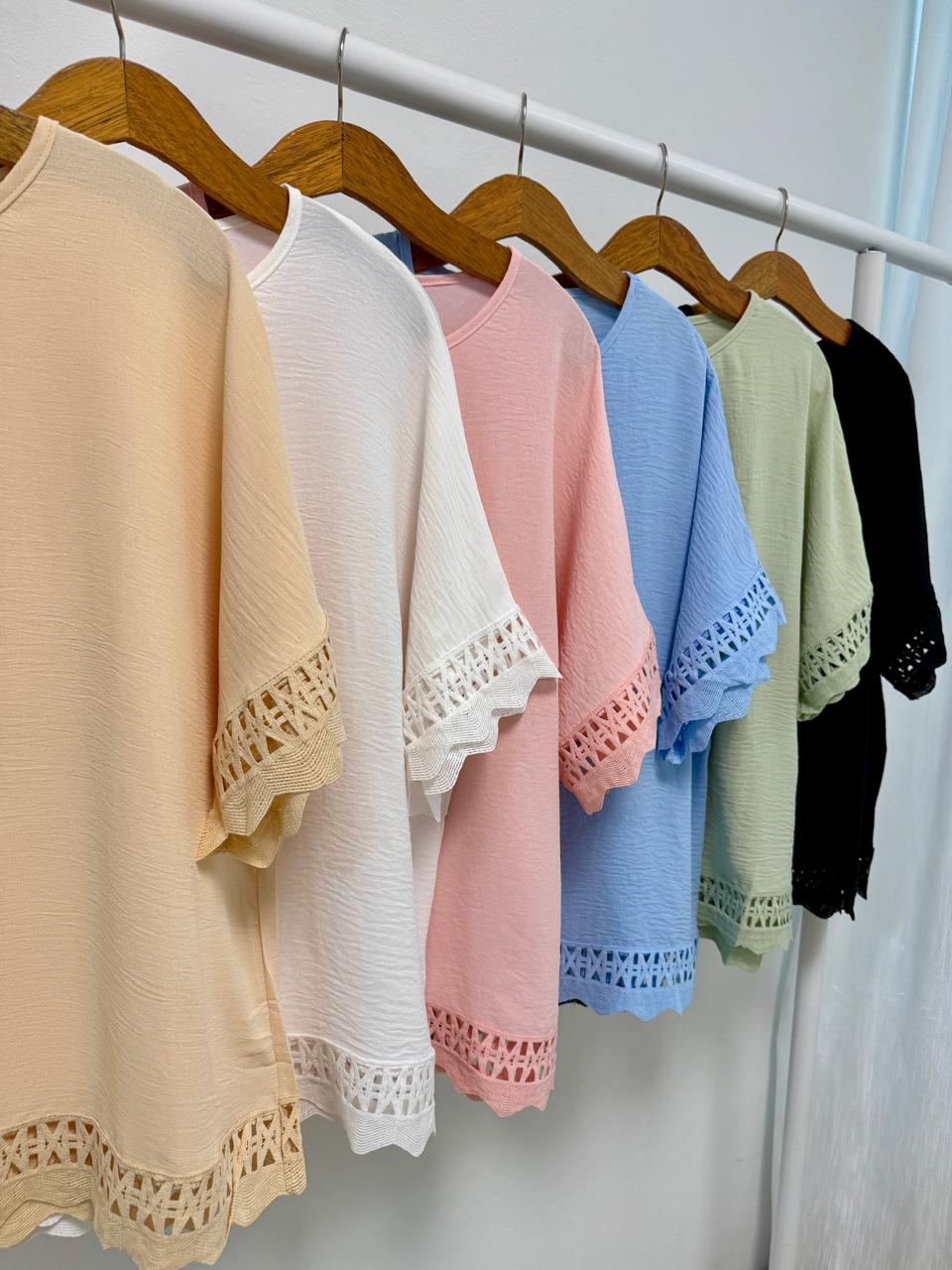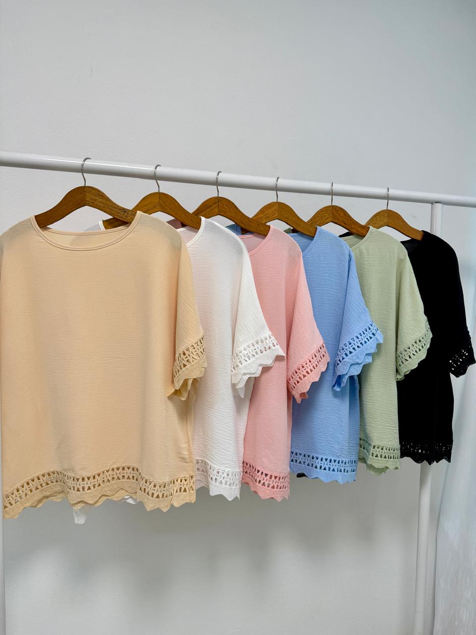 Blusa importada de Cey con puntilla en mangas y cintura. Talle único.
