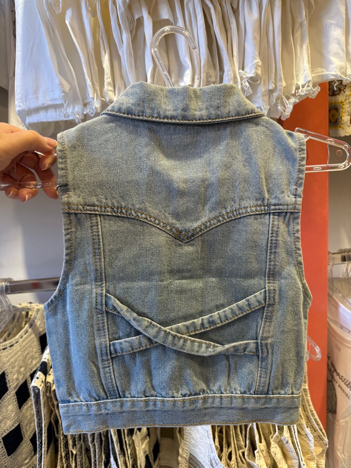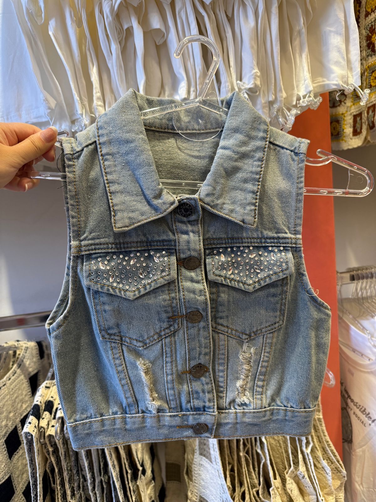 Chaleco de Jean importado calidad premium con detalles de strass en los bolsillos.