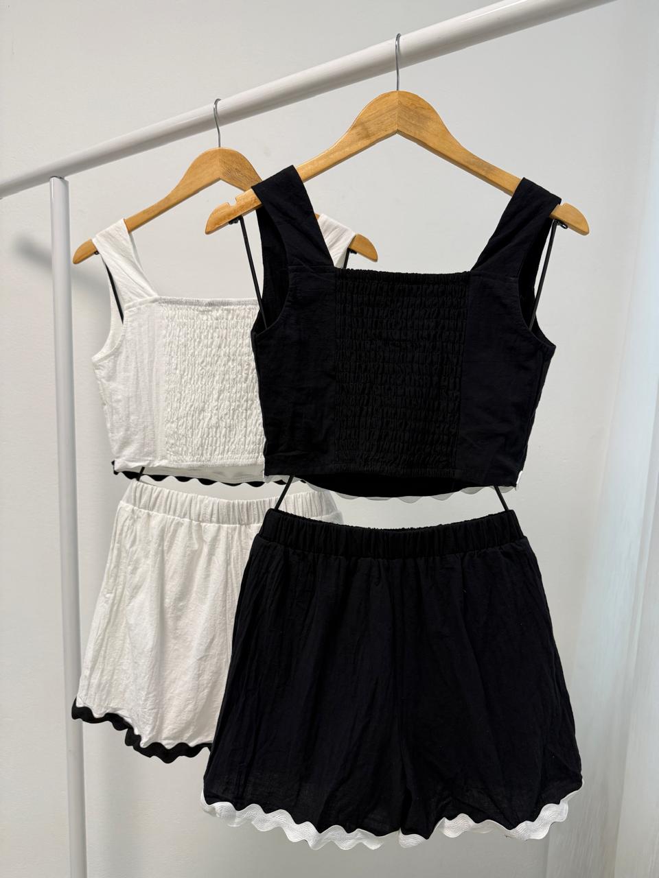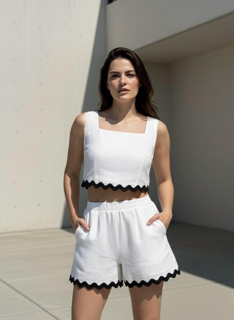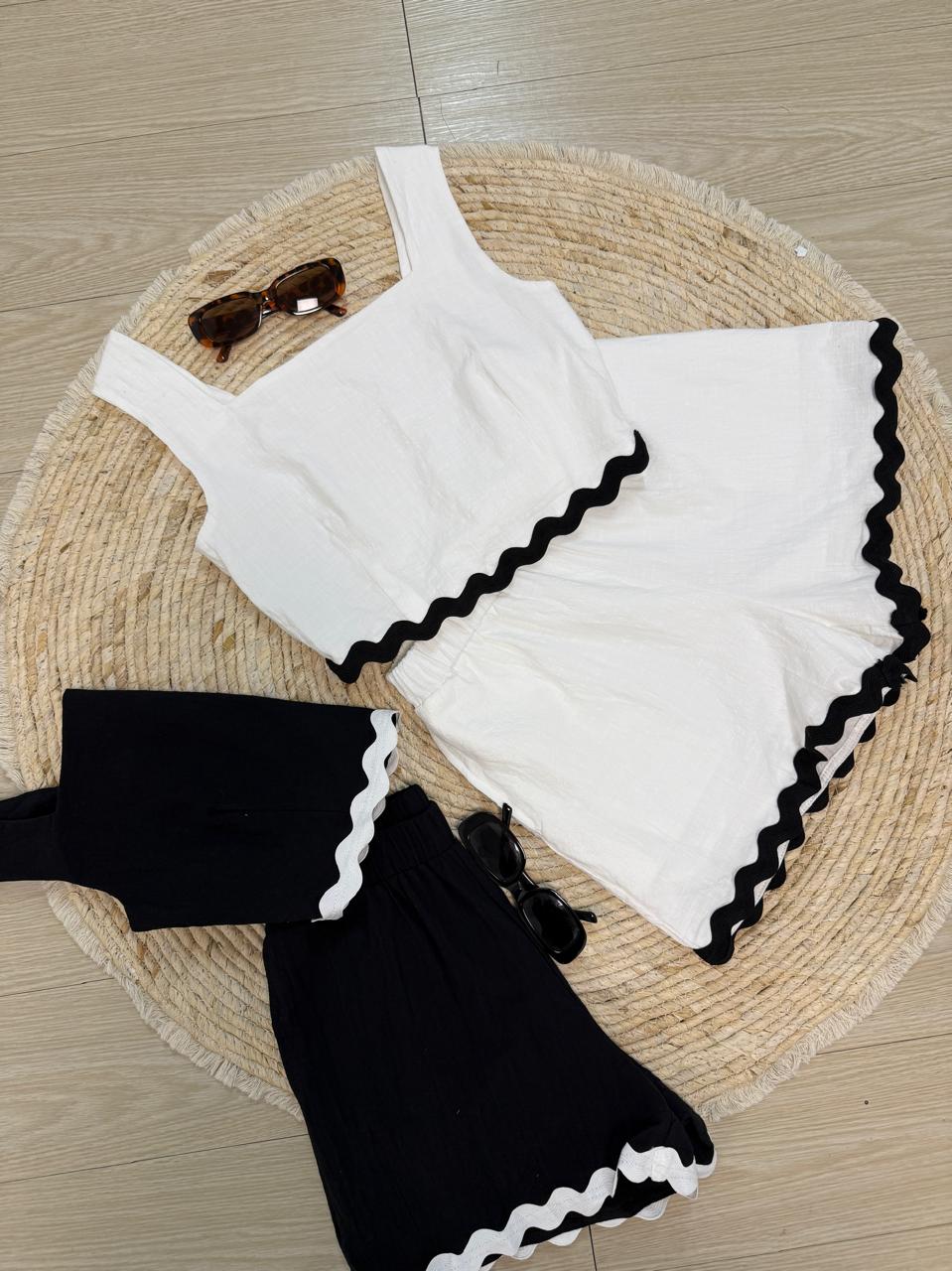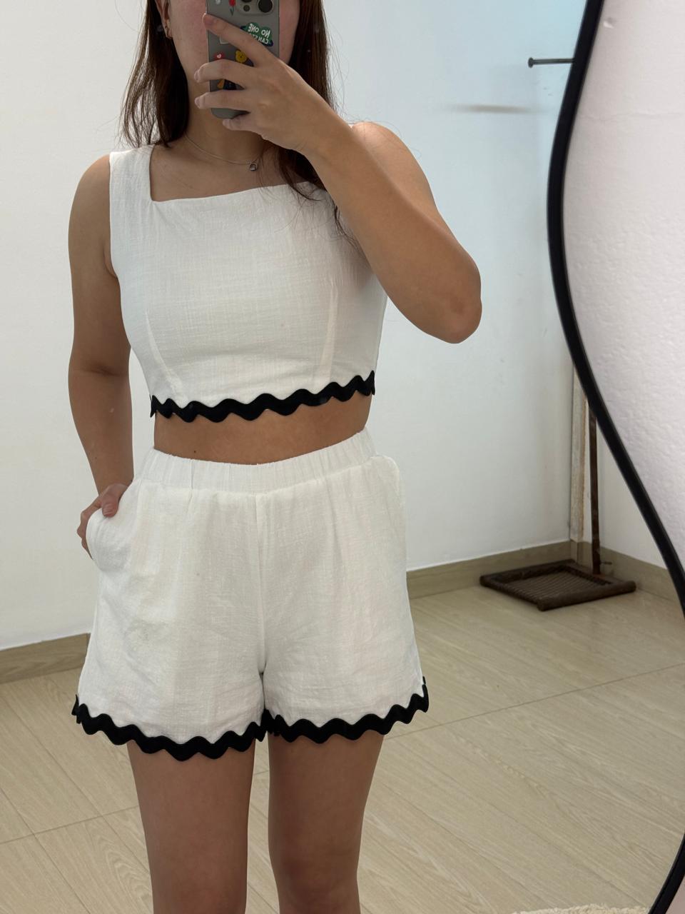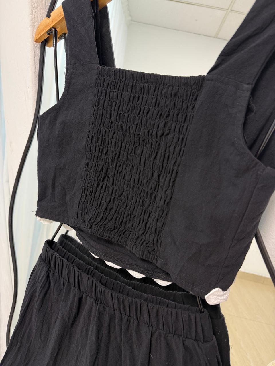 Conjunto de lino importado. Con detalle en los bordes y elástico en la espalda. Bolsillo incluido. Talle M y L.