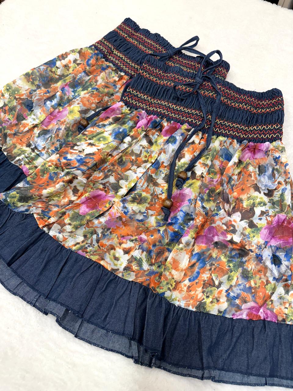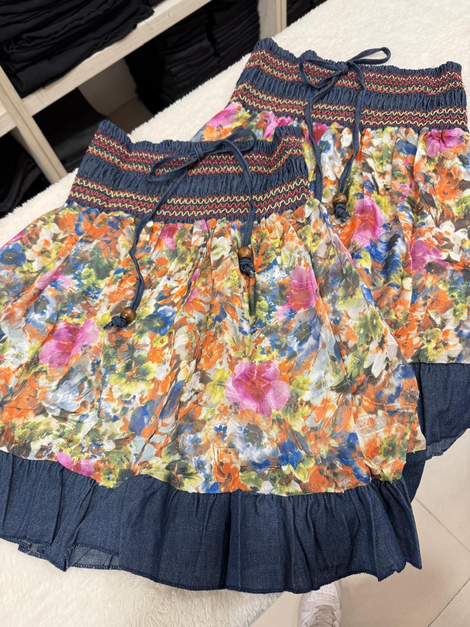 Con jean y gasa en el medio. Detalle con cordon y elastico.