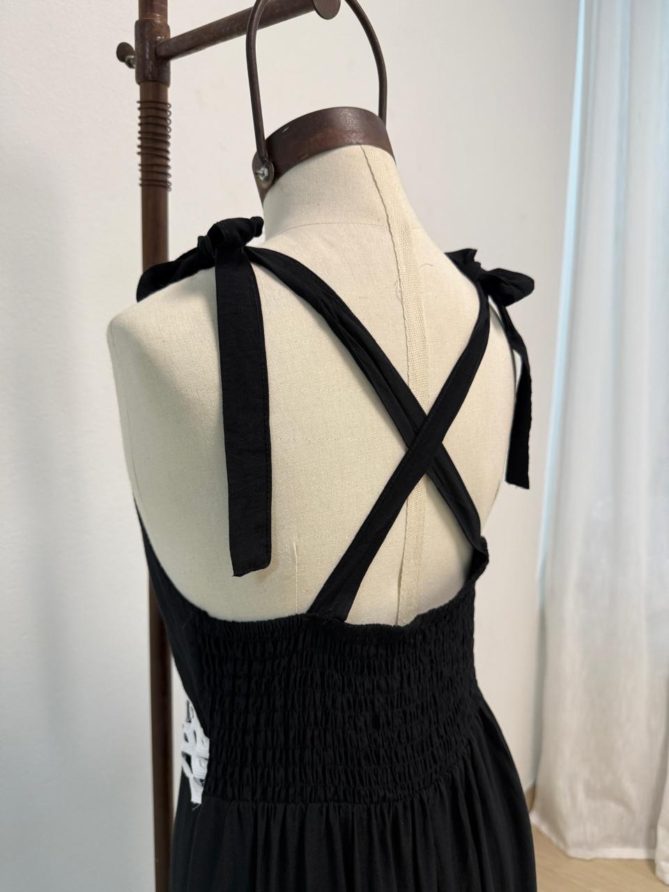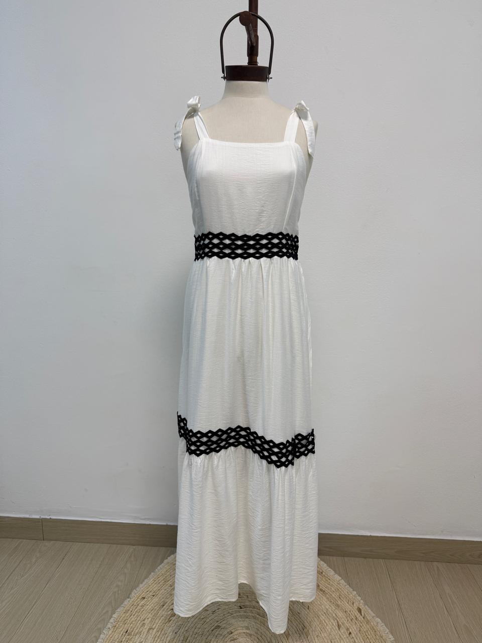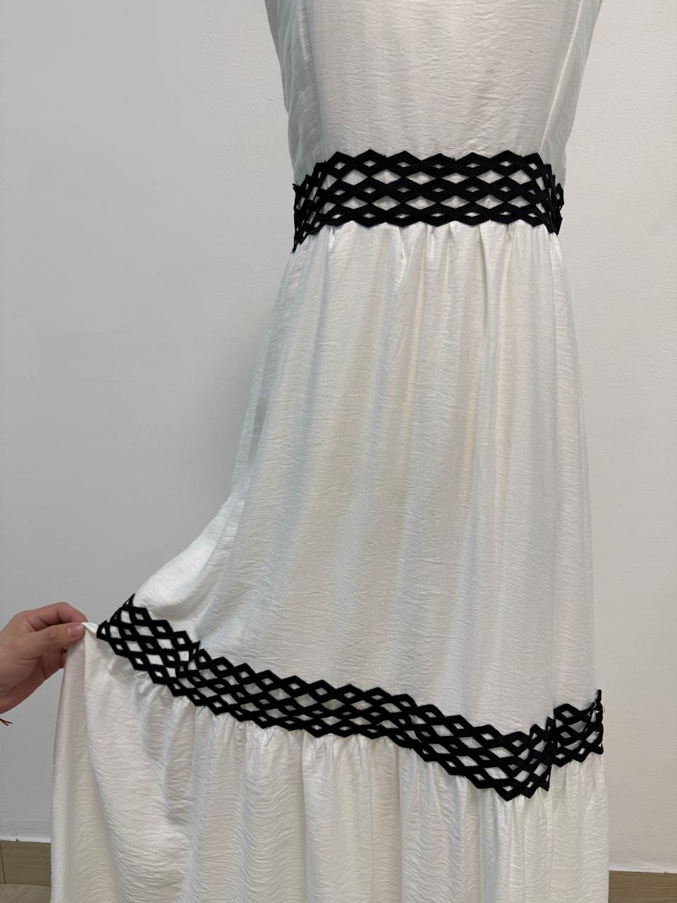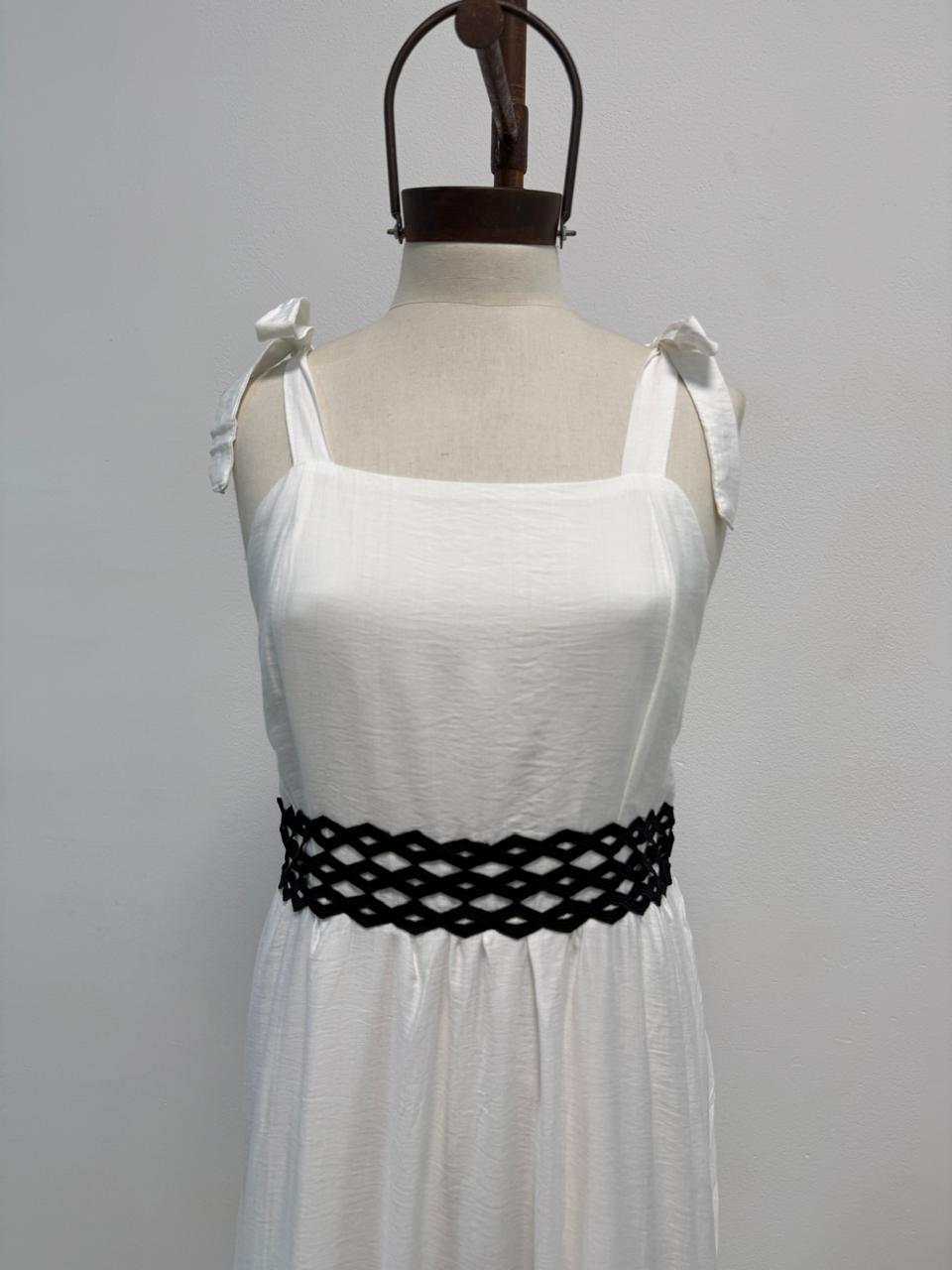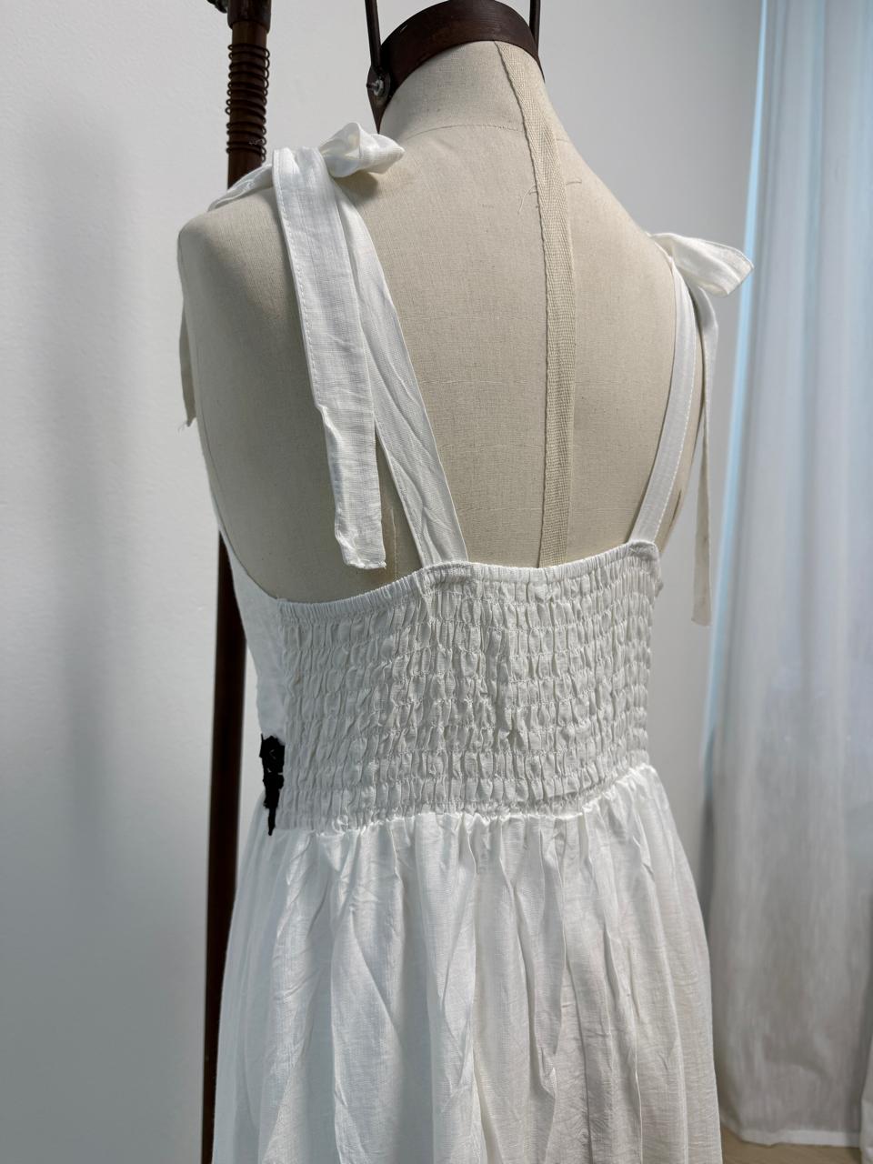 Vestido de lino importado con detalle en la cintura. Cinto ajustable y elástico en la espalda. Talle M y L. Color blanco con doble capa en el interior.
