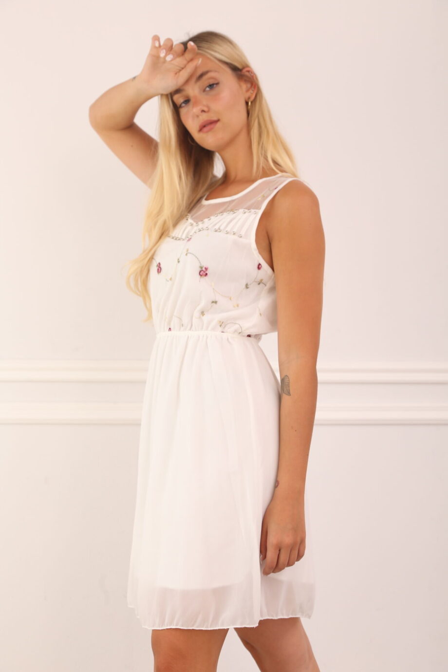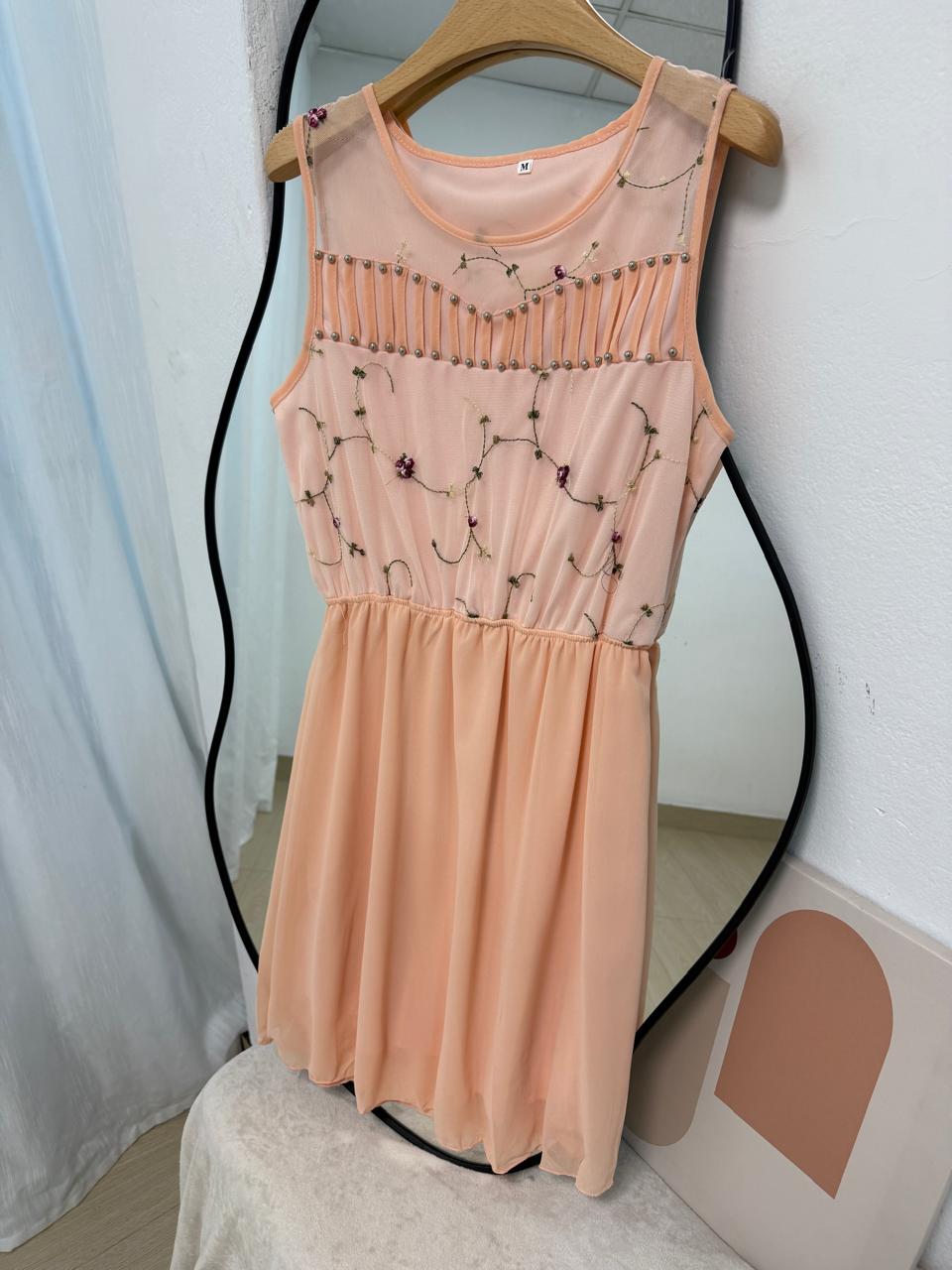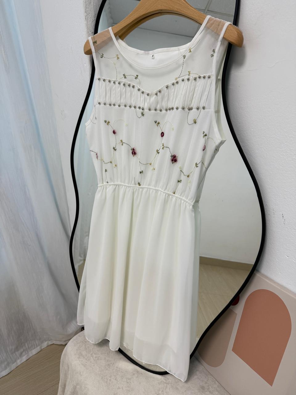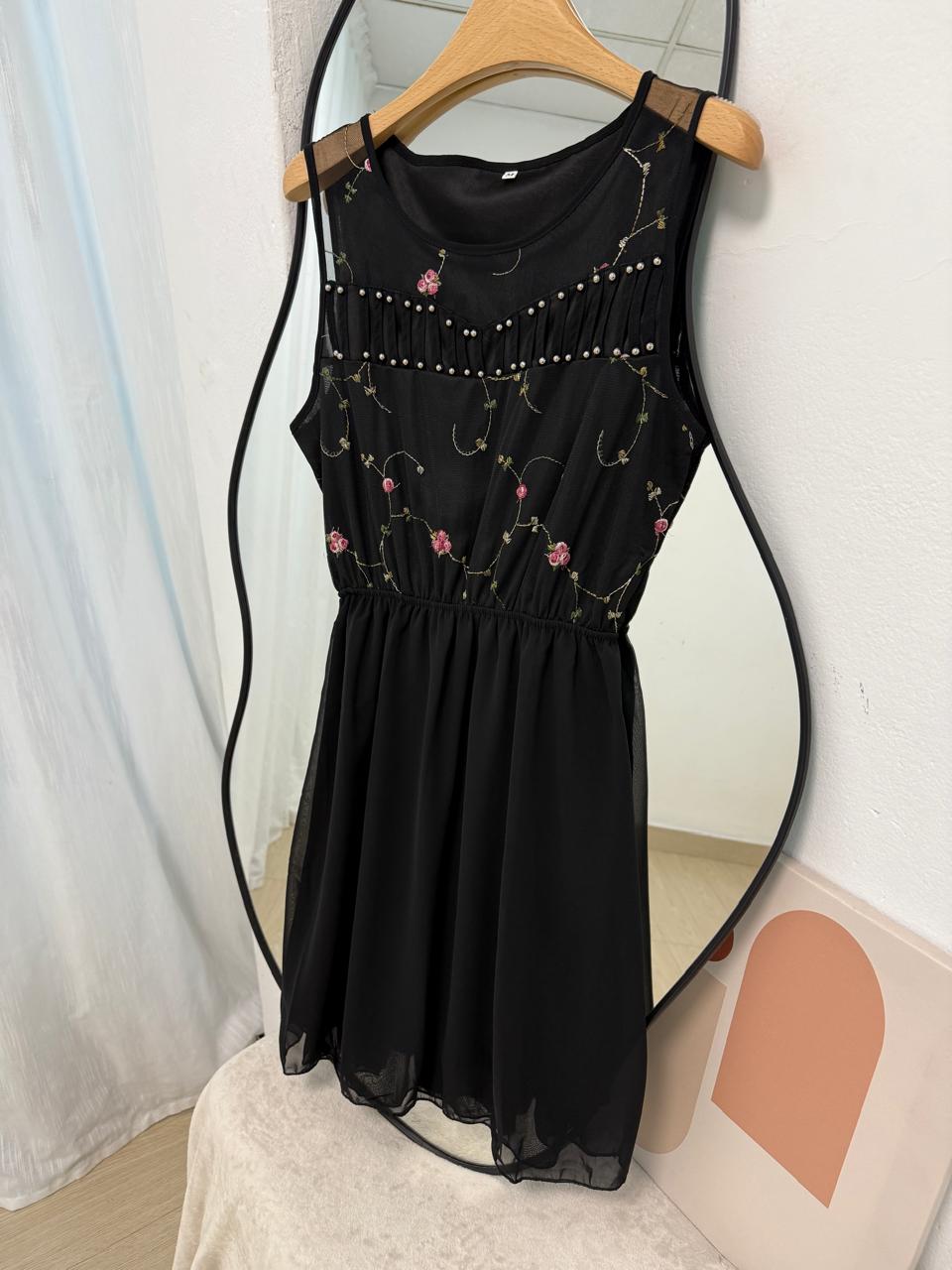 Vestido de gasa con detalles bordados y perlas. Disponible en M y L. Producto importado